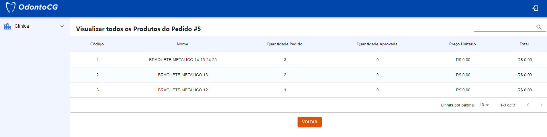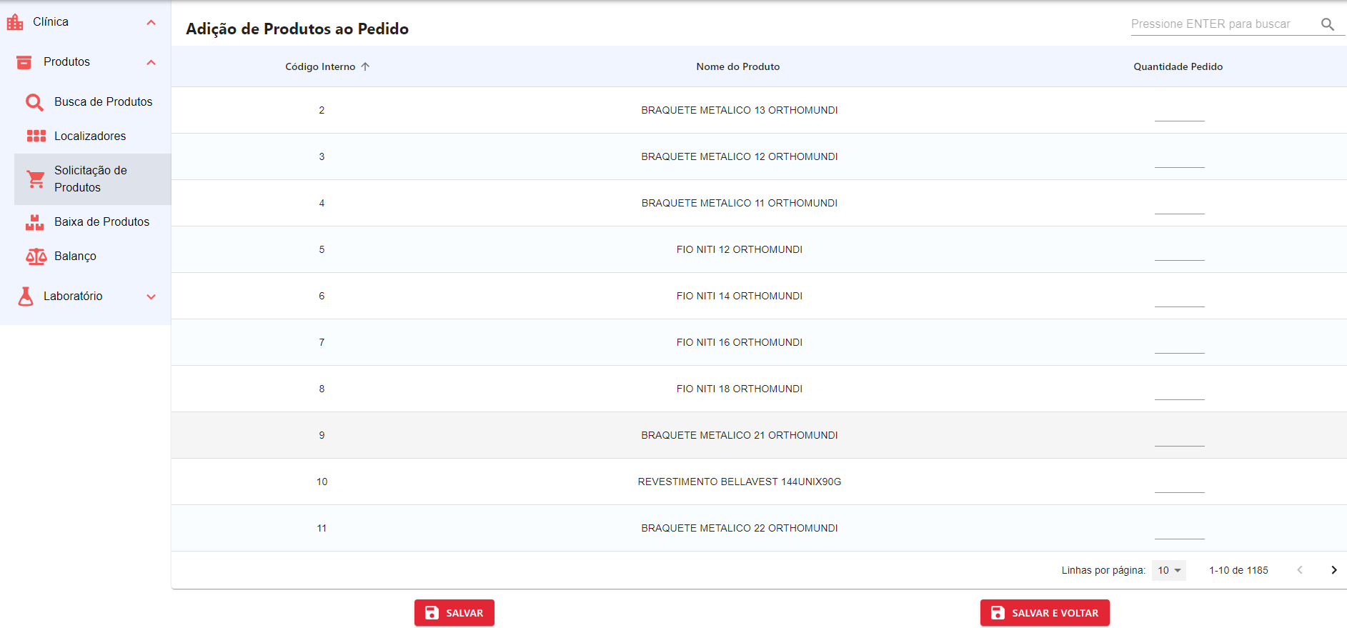 Após a inserção de produtos, o usuário pode clicar em Salvar ou Salvar e Voltar para retornar a página de listagem de pedidos.