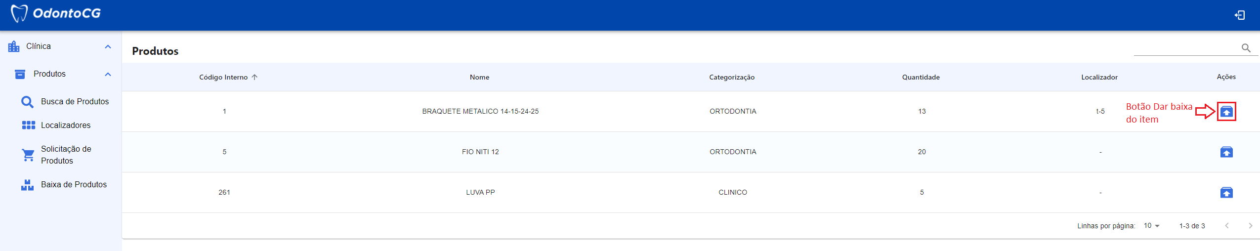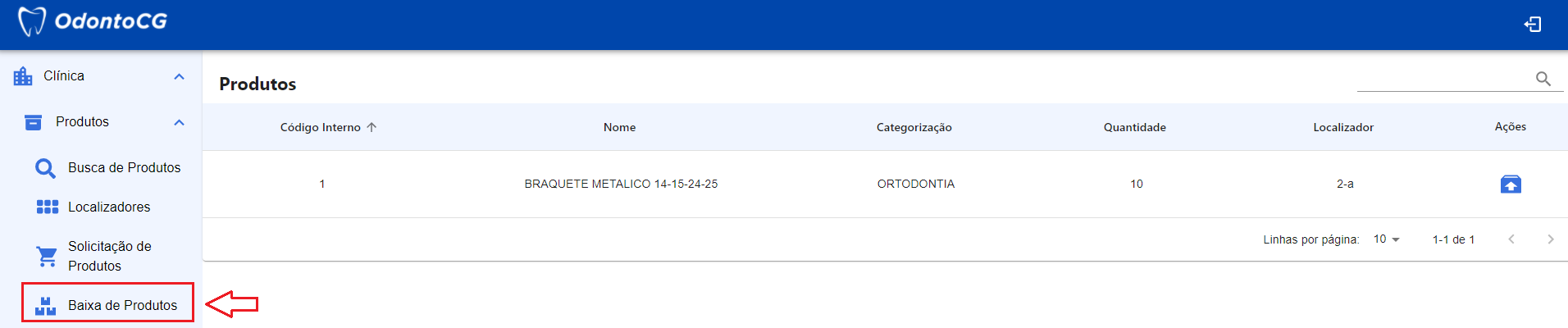 No menu do sistema, clique em Clínica > Produtos e selecione Baixa de Produtos, como exibido na Figura 19. Nesta tela o sistema retorna para o usuário todos os produtos a serem dado baixa.