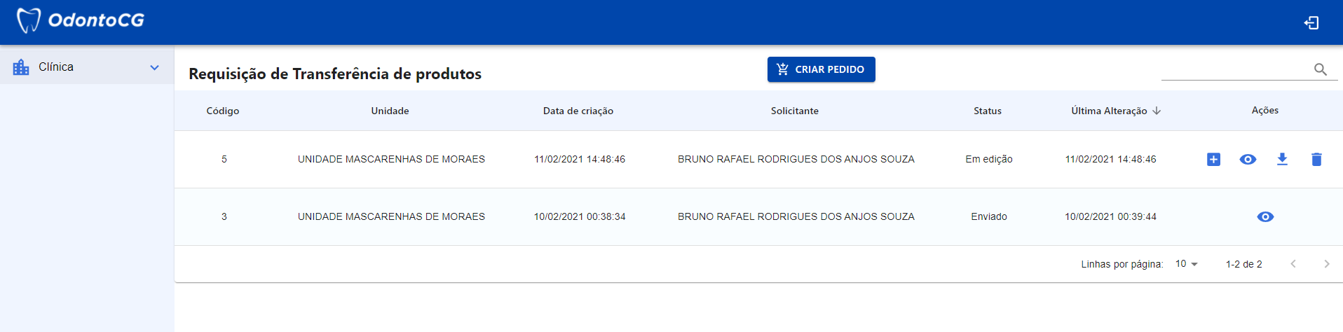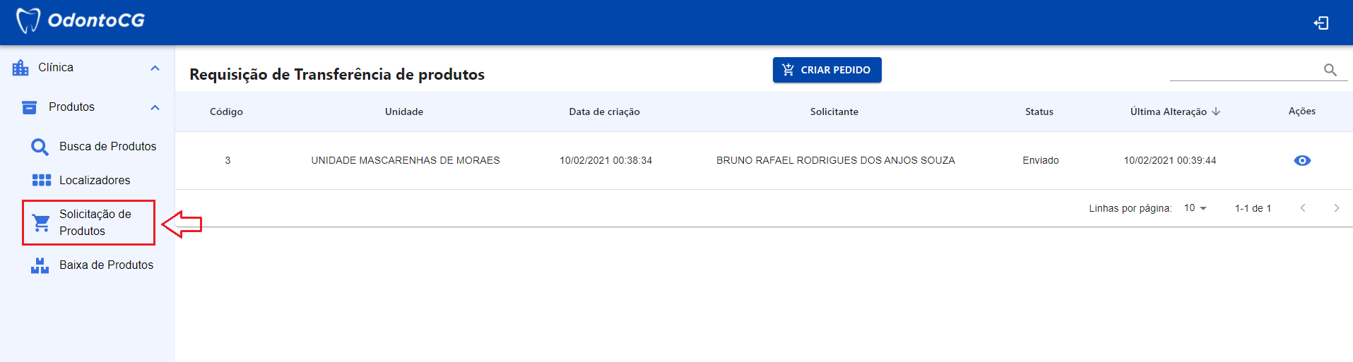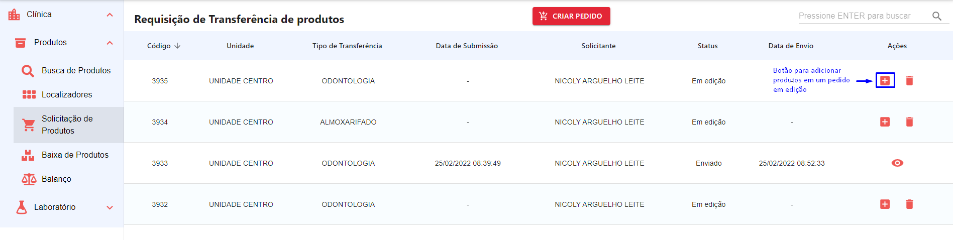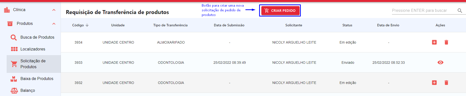 No menu do sistema, clique em Clínica > Produtos e selecione Solicitação de Produtos, como exibido na Figura 6. Nesta tela o sistema retorna para o usuário todas as requisições de transferência de produtos.