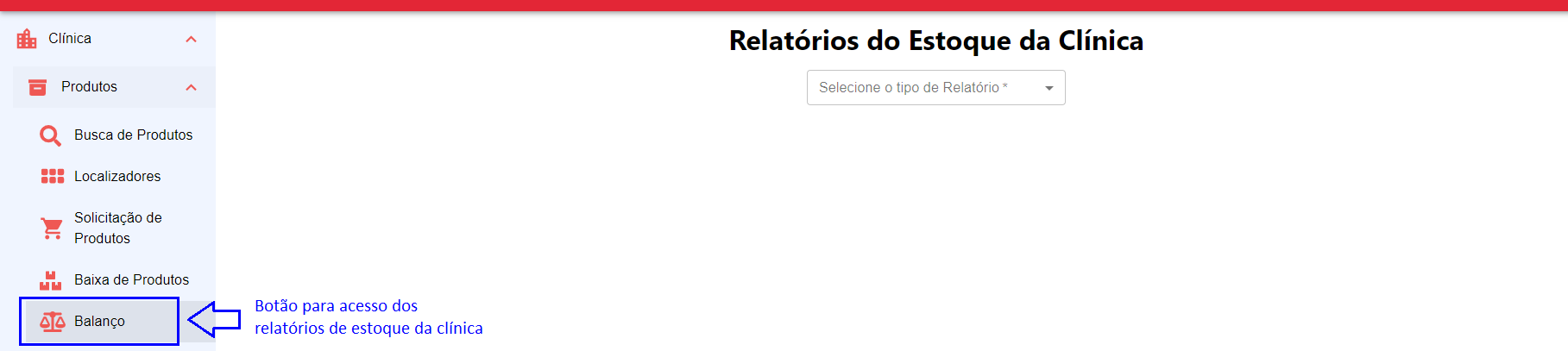 No menu do sistema, clique em Clínica > Produtos e selecione Balanço, como exibido na Figura 22. Nesta tela o sistema retorna para o usuário todos os produtos a serem dado baixa.