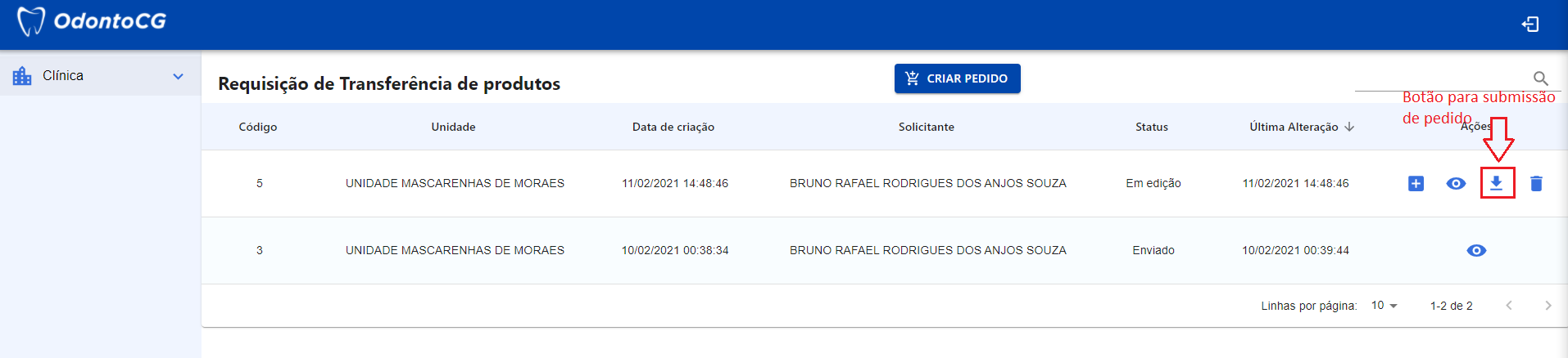 Para submeter pedido, basta o usuário clicar no ícone de submissão de pedido, como apresentado na Figura 15.