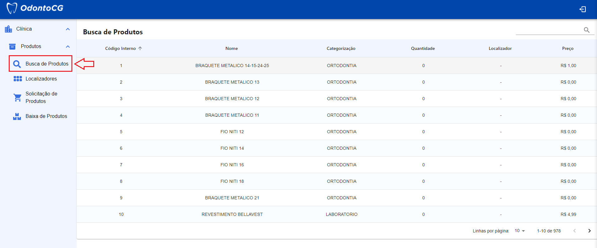 No menu do sistema, clique em Clínica > Produtos e selecione Busca de Produtos, como exibido na Figura 3. Nesta tela o sistema retorna para o usuário todos os produtos cadastrados de acordo com a sua unidade.
