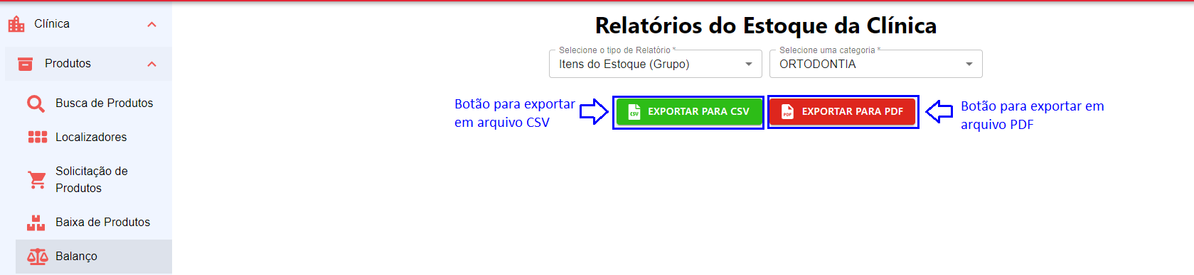 Figura 25 - Opções de exportação de Relatório do Estoque da Clínica por categoria em CSV ou PDF.