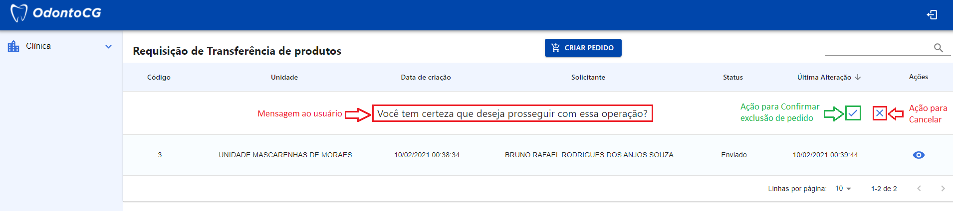 Para confirmar a Exclusão do Pedido, clique no ícone Check. Caso contrário, clique no ícone "X" para cancelar a operação, como apresentado na Figura 18.