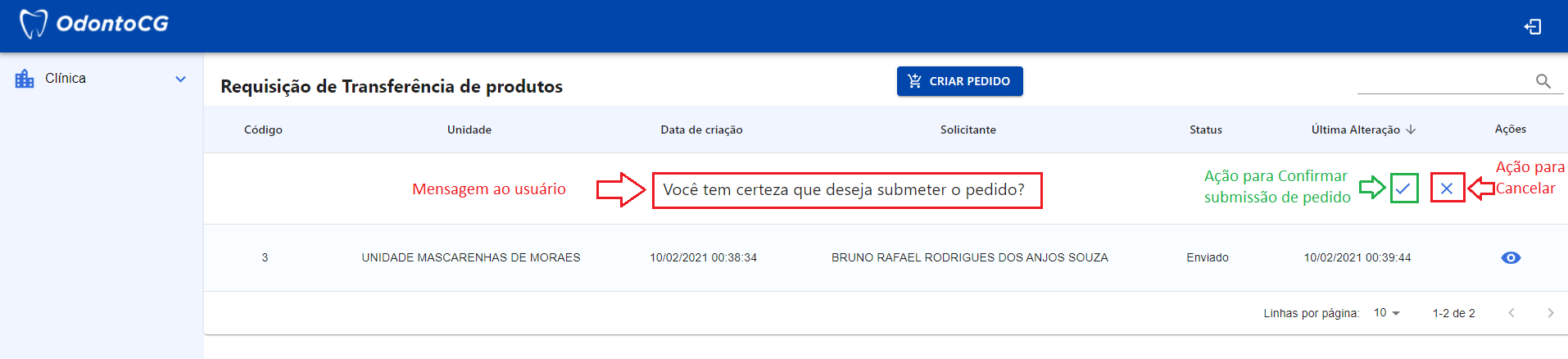 Para confirmar a Submissão do Pedido, clique no ícone Check. Caso contrário, clique no ícone "X" para cancelar a operação, como apresentado na Figura 16
