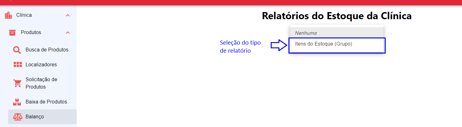 Na tela de Relatórios do Estoque da Clínica, selecione a opção Itens do Estoque (Grupo) para poder gerar o relatório de todos os itens do estoque por uma determinada categoria. A Figura 23 apresenta o menu de seleção para Relatório do Estoque da Clínica.