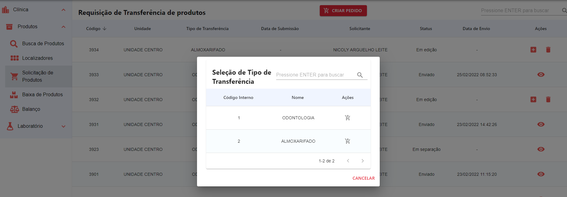 - Tipo de Transferência: Almoxarifado ou Odontologia