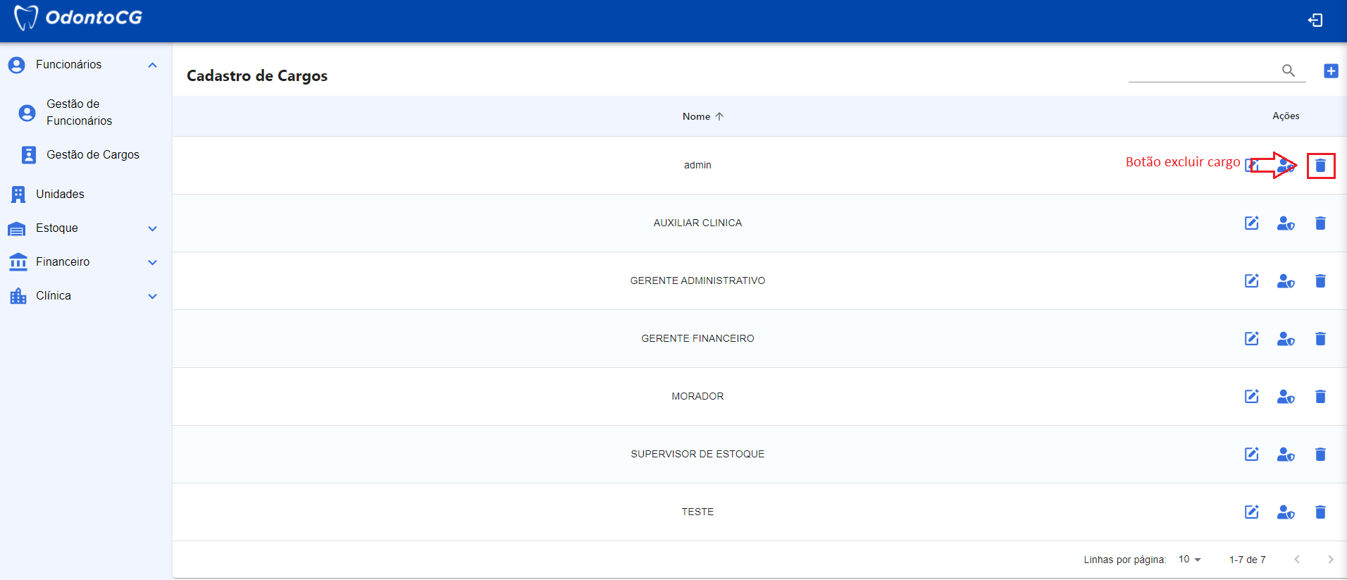 Na tela de Listagem de Cargo, o campo Ações, clique em "Excluir" para Excluir Funcionário, como apresentado na Figura 6.