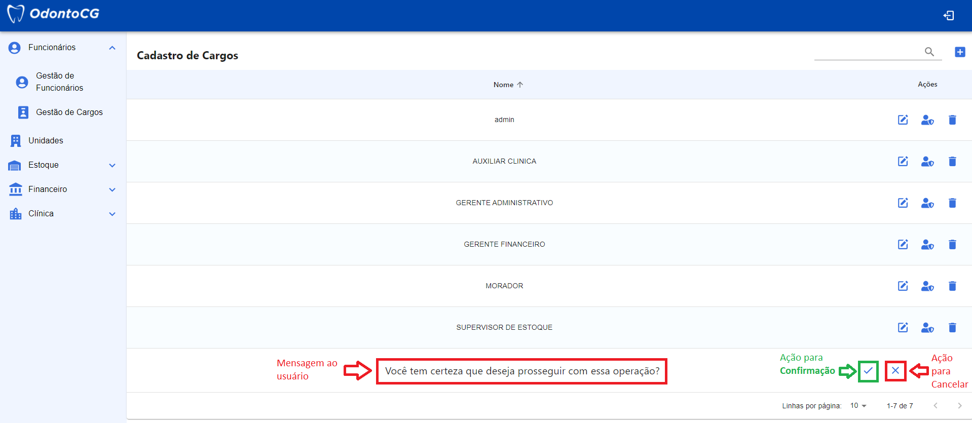 - Para confirmar a Exclusão, clique no ícone Check. Caso contrário, clique no ícone "X" para cancelar a operação, como apresentado na Figura 7.