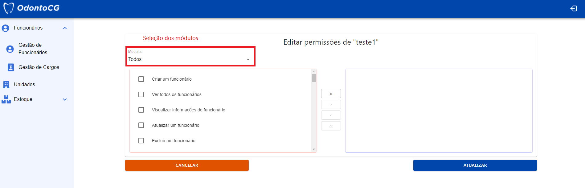 Após a seleção do Módulo desejado, é possível realizar a vinculação de permissão para um cargo. Na coluna da direita são exibidas as permissões disponíveis do módulo selecionado e na coluna da esquerda são exibidas as permissões selecionadas ao cargo, como apresentado na Figura 10.