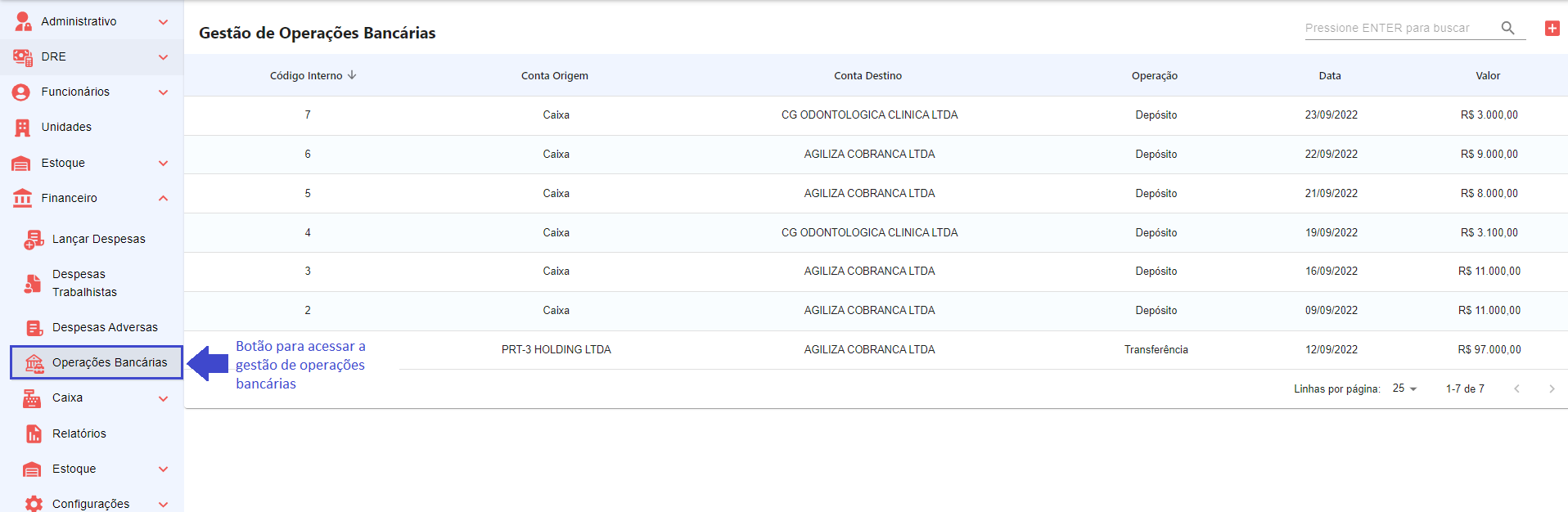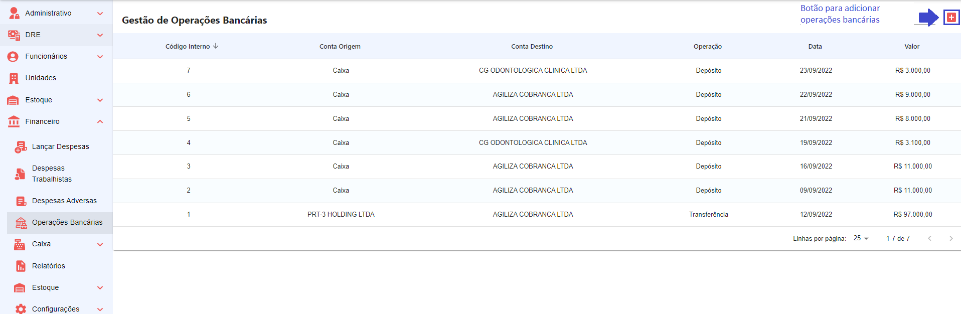 No menu do sistema, clique em Financeiro > Operações Bancárias, para acessar a área de listagem de Operações Bancárias, conforme apresentado na Figura 1.