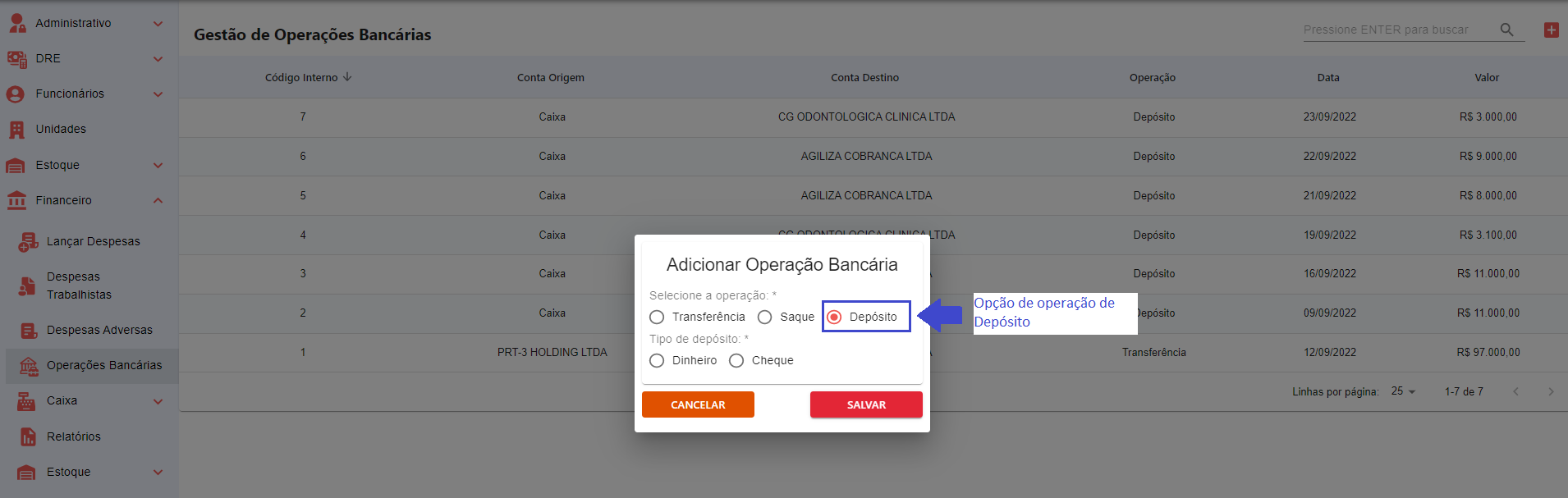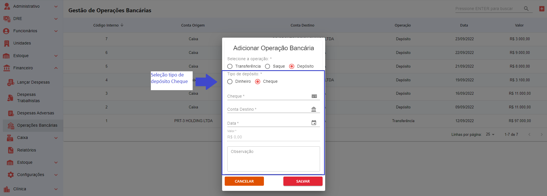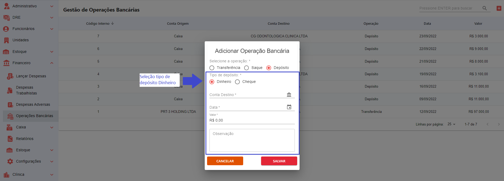 Clique em Salvar para efetuar o cadastro de um depósito. Caso contrário, clique em Cancelar para voltar a tela de listagem de Operações Bancárias.