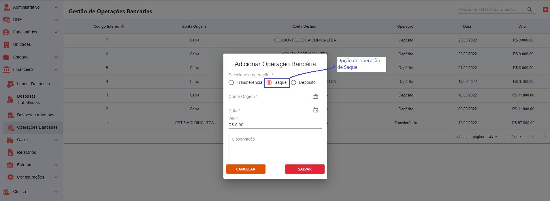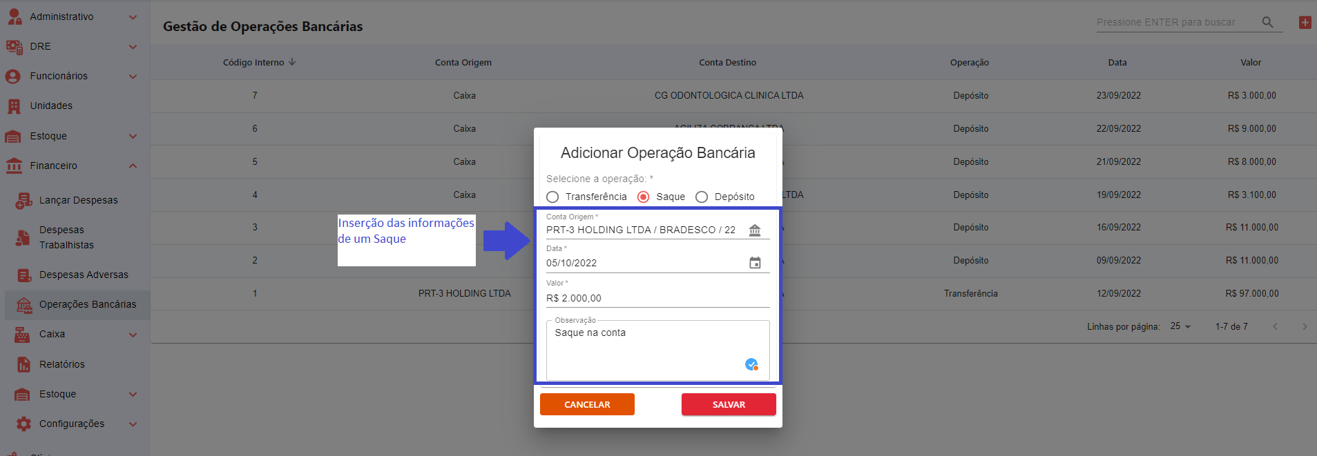 Clique em Salvar para efetuar o cadastro de uma saque. Caso contrário, clique em Cancelar para voltar a tela de listagem de Operações Bancárias.