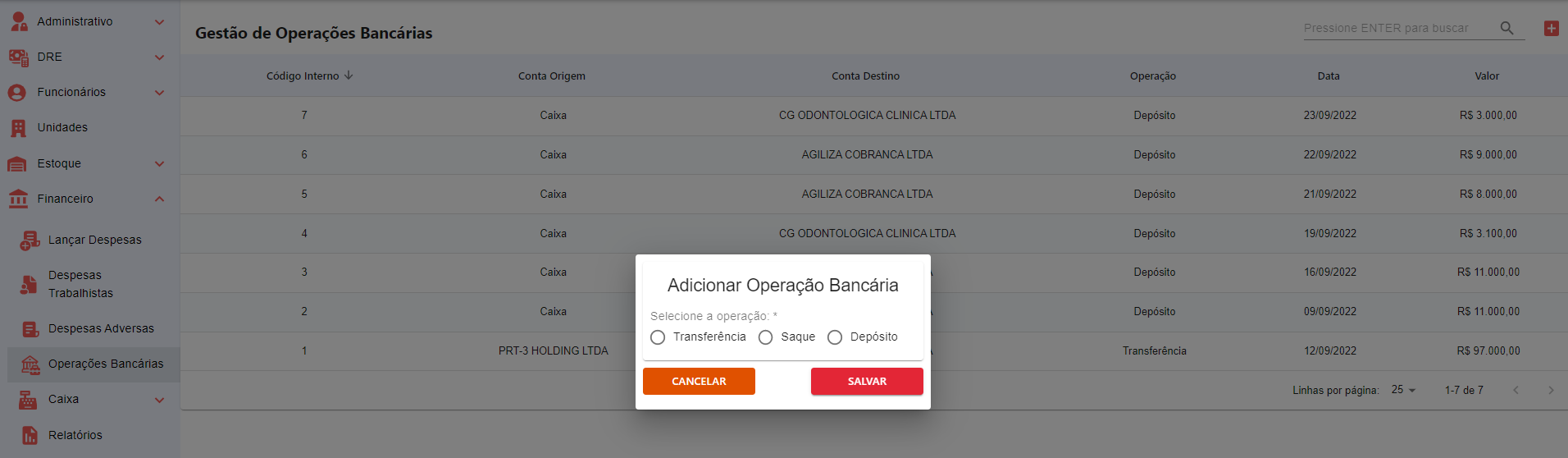 Nessa seção do documento é apresentada as funcionalidades relacionada ao Módulo Financeiro na funcionalidade de Gestão de Operações Bancárias. Esta funcionalidade permite que a gestão de operações bancárias.