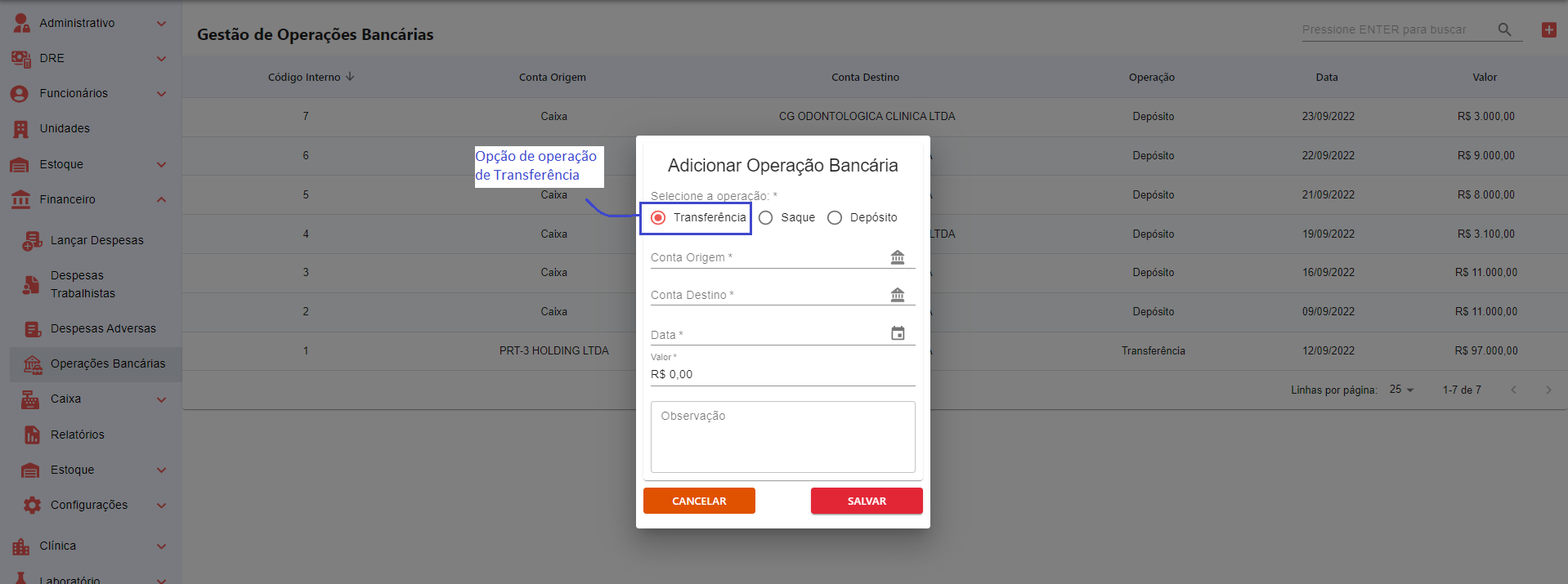 Clique em Salvar para efetuar o cadastro de uma transferência. Caso contrário, clique em Cancelar para voltar a tela de listagem de Operações Bancárias.